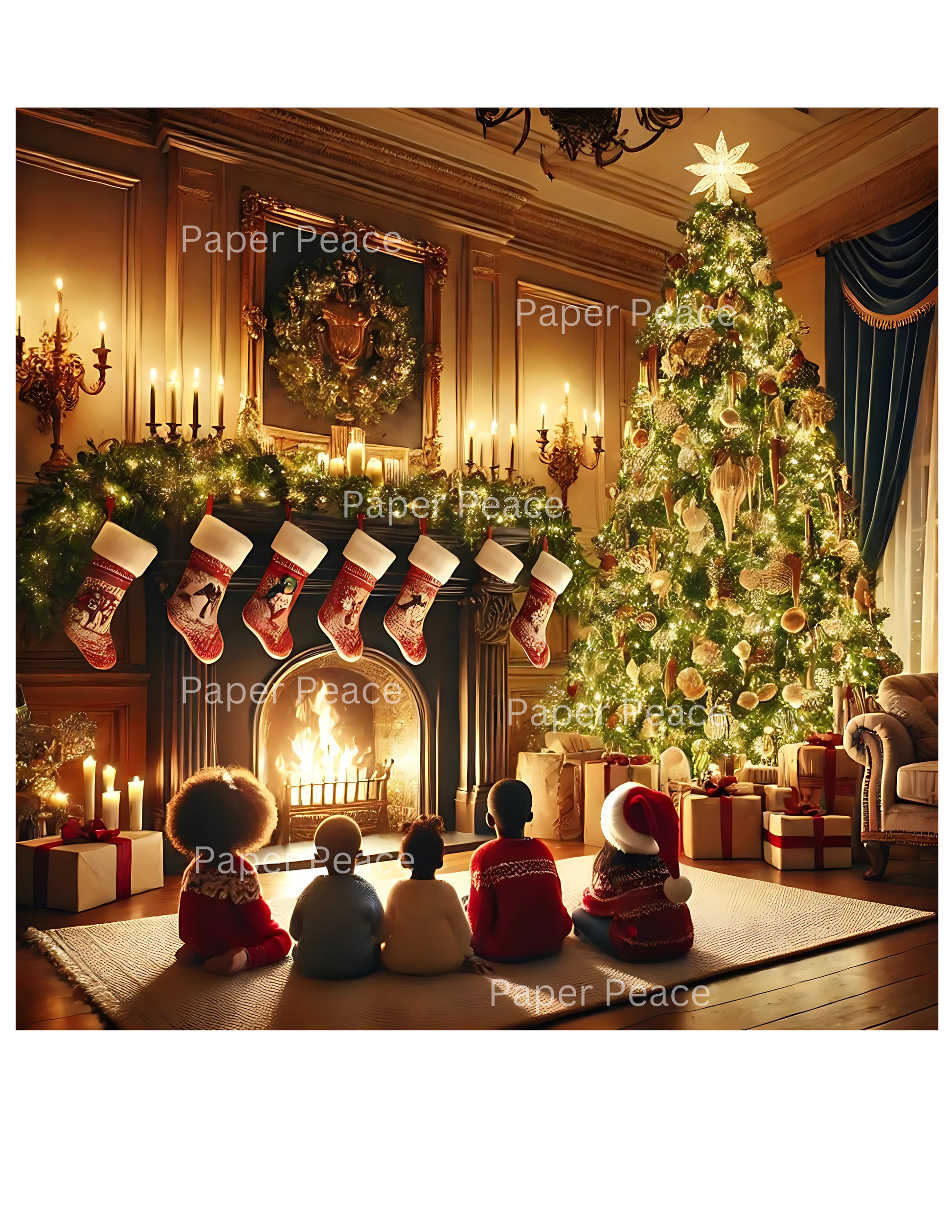 African American Children Looking at Christmas Tree Sitting Around Fireplace