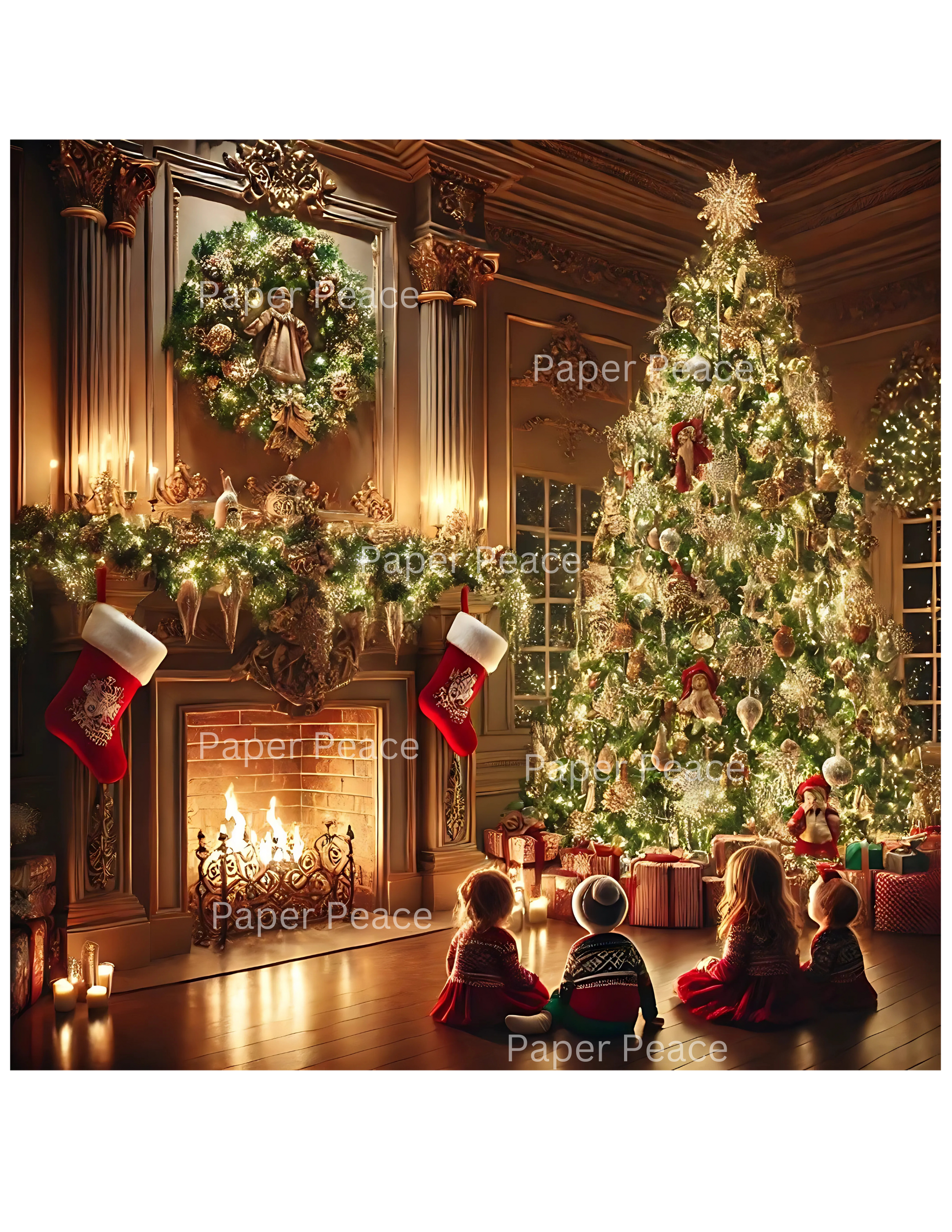 Children Looking at Christmas Tree Sitting Around Fireplace