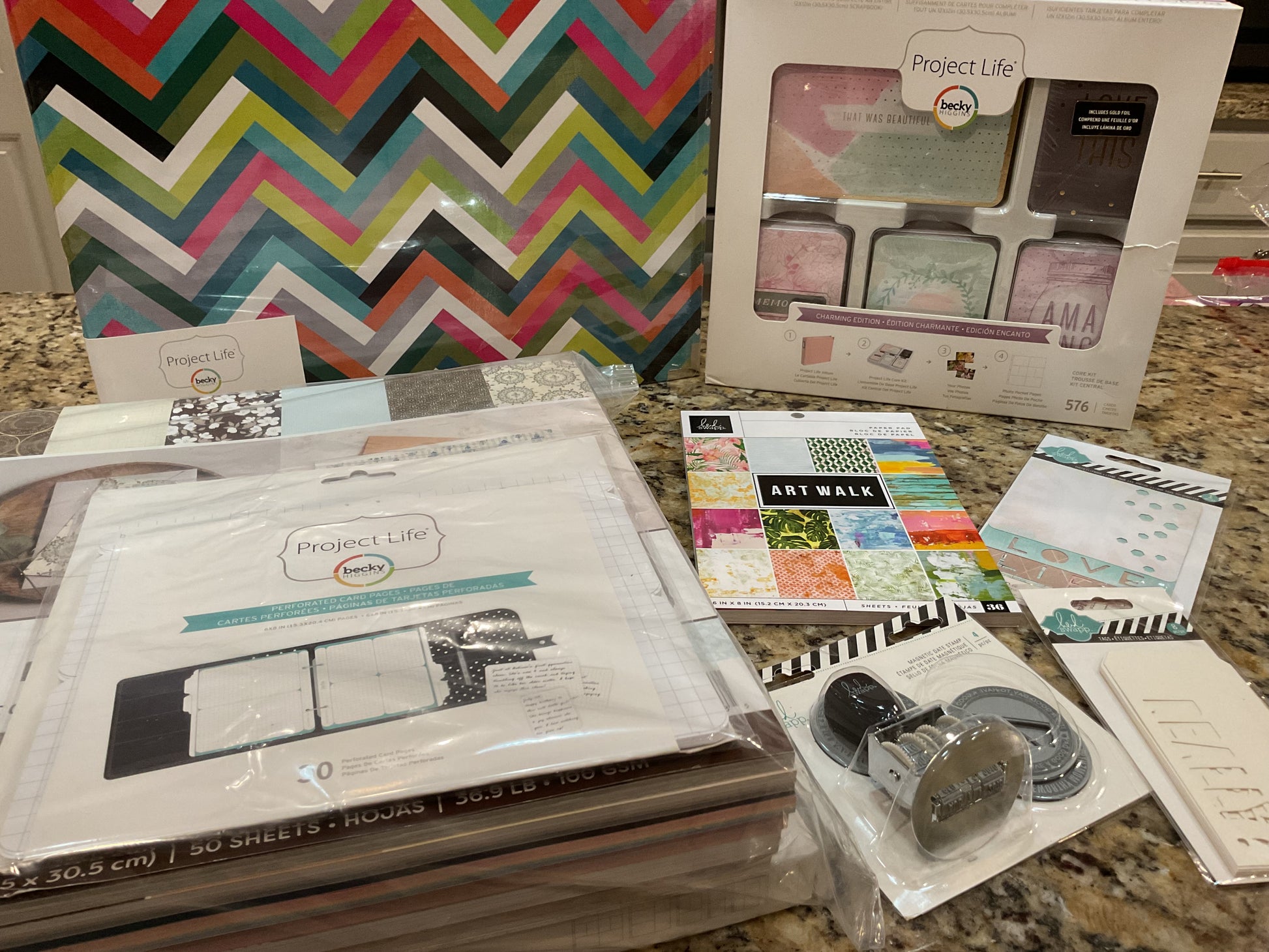 This package includes one of the Heidi Swapp “Project Life” notebooks, 7 12x12 scrapbook paper pads, 1 6x8 paper pads and Heidi Swapp ephemeral inclusive along with a magnetic stamp