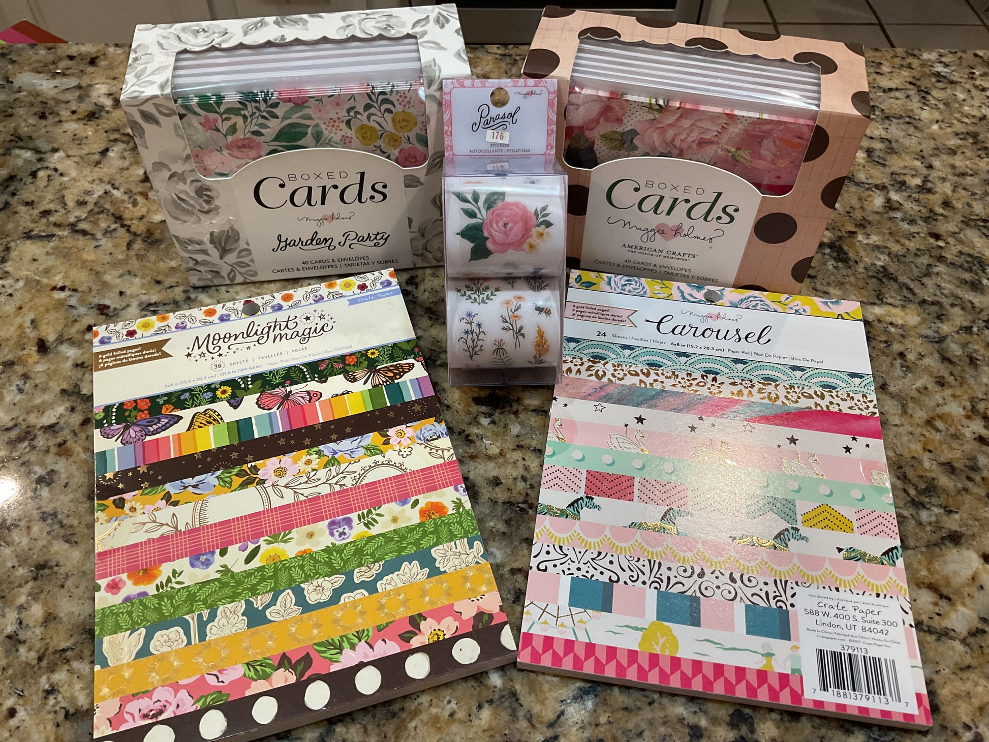 This box includes 2 (6 x 8) specialty scrapbook pads, 2 boxes of cards and envelopes and 1 roll of washi tape.