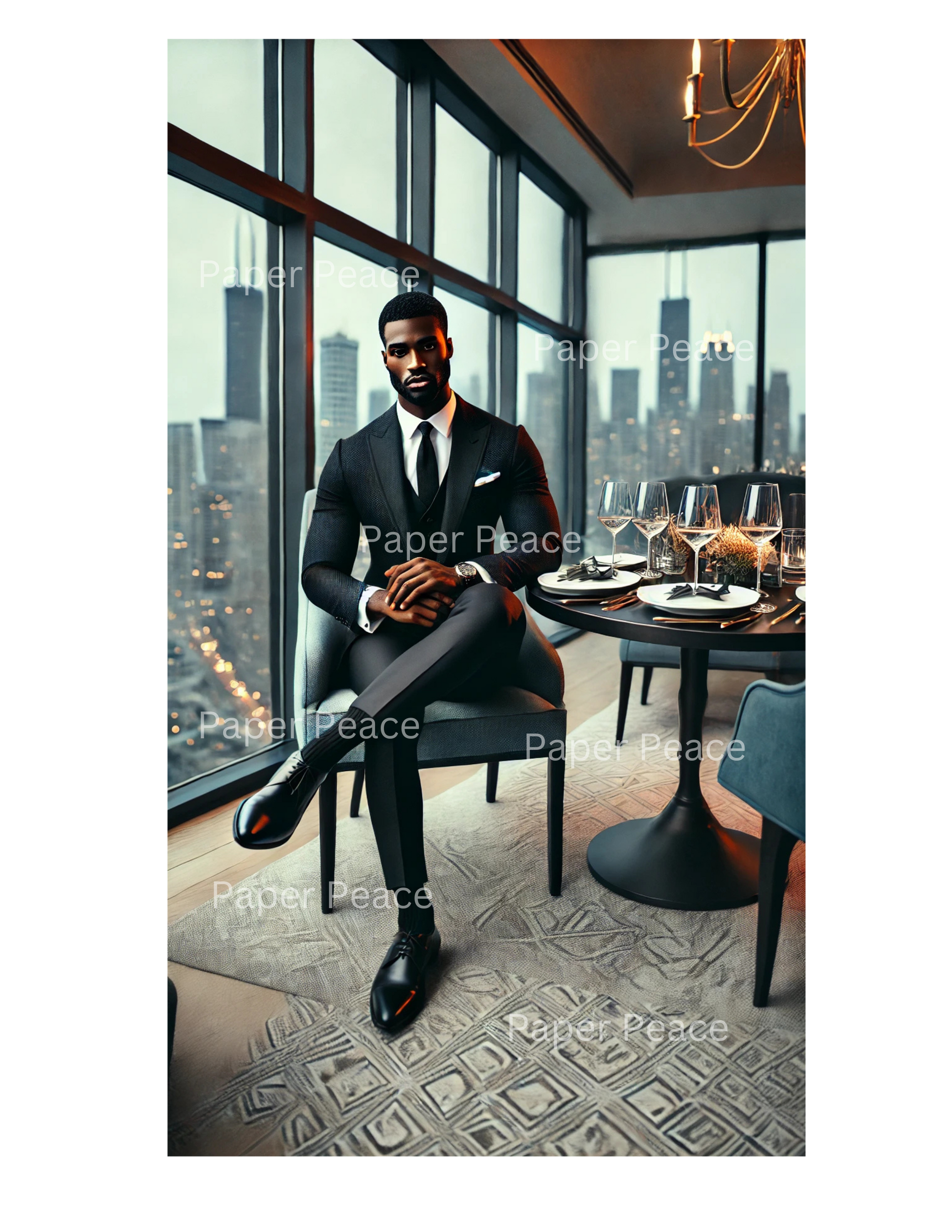 Handsome African American Gentleman w/Beard Having Dinner Overlooking Chicago Skyline