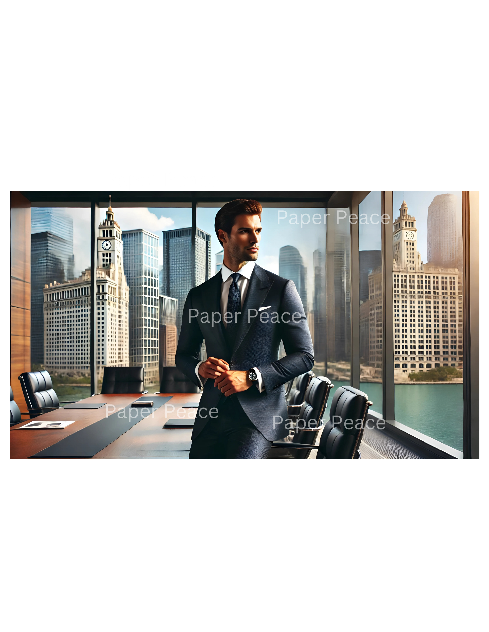 Handsome Caucasian Gentleman in Executive Board Room Overlooking Chicago Skyline