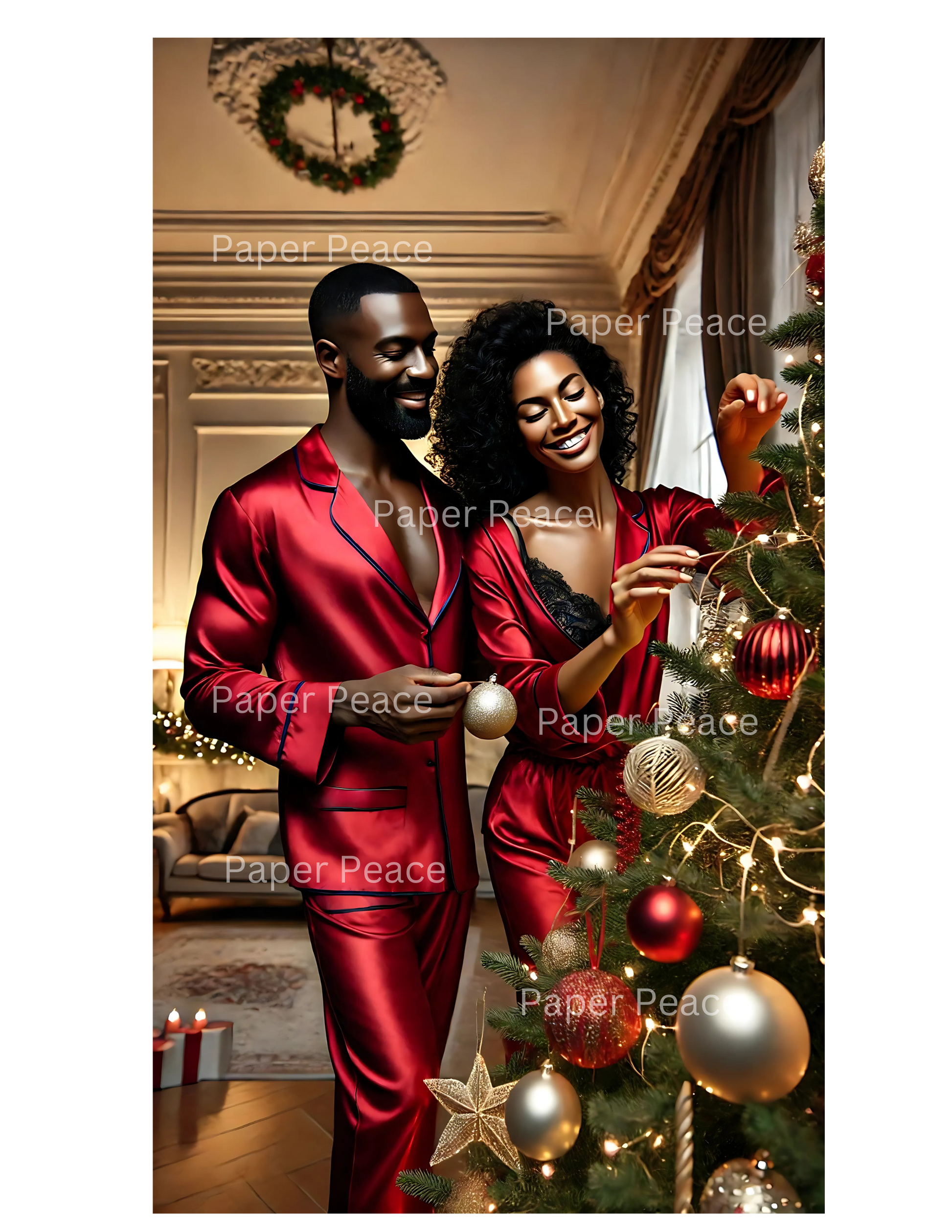 Happy Black Couple Decorating Christmas Tree in Red Satin Pajamas