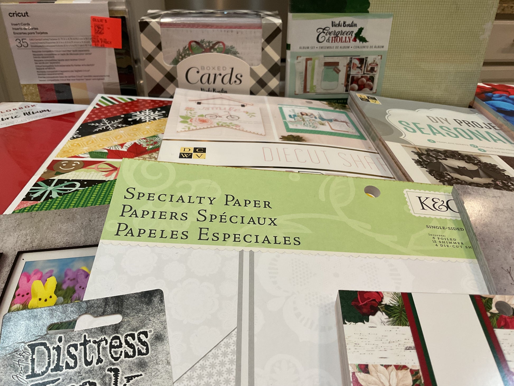 This Holliday DeSTASH Box includes 1 set of 4 Tim Holtz Mini Distressed ink pads, 3 Broadcloth fabrics (1 yard each), 7 paper pads (1 project pad), 2 albums (Vickie Boutin Evergreen Holly Album Set & 1 Colorbok Fabric Scrapbook with 10 Sheet Protectors) stickers, decorative card set, 1 gold glitter self adhesive sticker sheet (12x24) and Cricut cards just to name a few